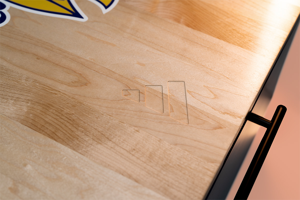 The lid was fabricated from maple and finished to replicate a basketball court surface, complete with accurate court graphics and a high-gloss finish that mirrored hardwood flooring.